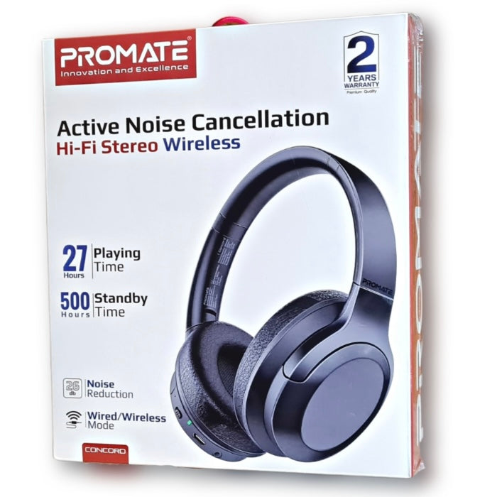 Promate Concord ANC High-Fidelity Stereo Wireless Headphones deliver an exceptional listening experience with high quality and clarity of sound. These headphones feature active noise cancellation technology to provide a pleasant, distraction-free environment. You can easily connect to these headphones via Bluetooth v5.3 to enjoy music and audio content without wires, and you can also use the 3.5mm input for wired connection with a variety of devices.