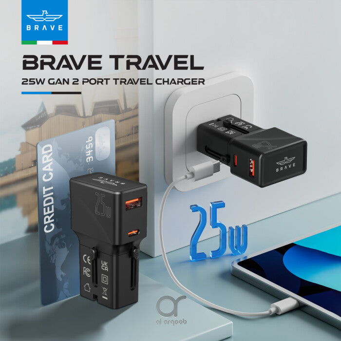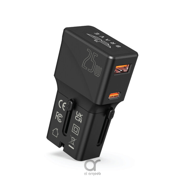 Brave 25W GaN2 International Travel Charger with Fast Charging, USB-A and USB-C Ports, and Universal Plug Compatibility