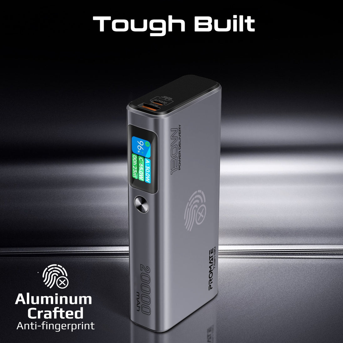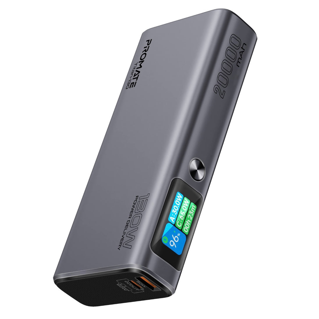 Promate portable charger with a capacity of 20,000 mAh and a power of 130 watts, with a screen to display the charging percentage, providing you with the ability to charge your devices quickly and efficiently while on the go.
