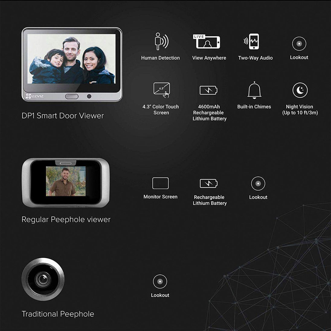 EZVIZ DP1 Smart Door Viewer - Turn your standard peephole into a smart video viewer. The DP1 is a wire-free smart door viewer with motion detection, allowing you to see and speak to the person at your door. With HD video and clear two-way intercom via the EZVIZ app, you'll never miss a visitor