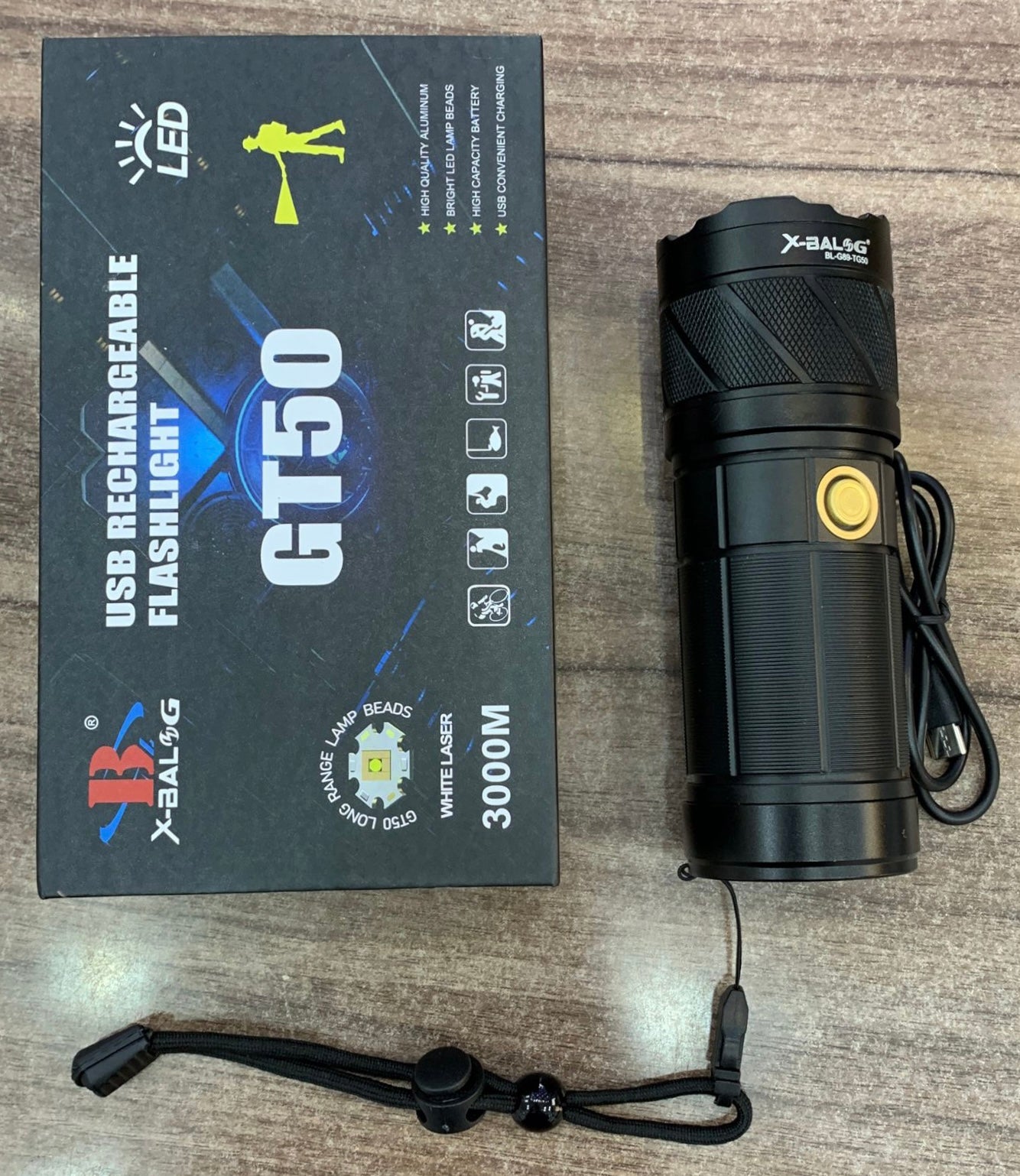 A portable searchlight that lights up to a distance of 3000 meters with different lights and supports charging the phone, model GT50