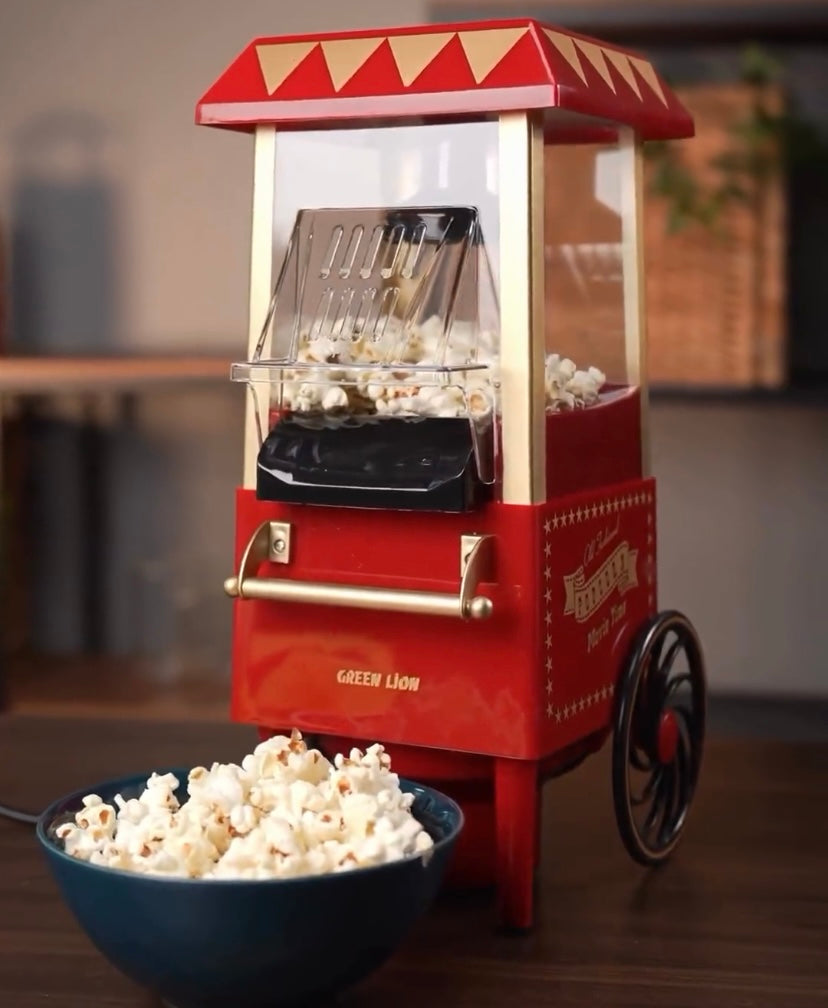 The classic popcorn maker makes a convenient and elegant addition to your home. This maker comes with a lid and air outlet, ensuring you can enjoy fresh popcorn with ease. The aluminum cup and standard spoon make making simple. Simply slide the on/off button and let it work its magic. It uses transparent high temperature resistant PC materials on four sides, ensuring safety and durability. With advanced hot air technology, it pops popcorn efficiently, making movie nights more enjoyable. Its compact size and exquisite craftsmanship make it ideal for home use or as a charming display piece. Enjoy effortlessly home-made popcorn with the Vintage Green Lion Popcorn Maker.