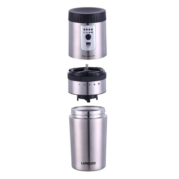 The LePresso Portable Coffee Maker with Mug Grinder in Silver is the perfect gadget for coffee lovers. This innovative device combines a coffee grinder and mug in one, with a powerful 1600mAh battery that can complete 15 grinding cycles on a full charge. It is designed to hold 18g of coffee beans, enough for a 250ml cup of freshly brewed coffee. The ceramic grinder allows you to adjust the grind size to suit your taste, whether you prefer medium or deep roasted beans. It is made from high-quality materials, including ABC plastic, ceramic, and stainless steel. This ensures durability and style. The mug also has a Type-C charging port. It recharges quickly, in 2-3 hours. It also has a drip filter for smooth, clean coffee. Whether you are at home, at work, or on an adventure, the LePresso brings you fresh coffee with convenience and taste.