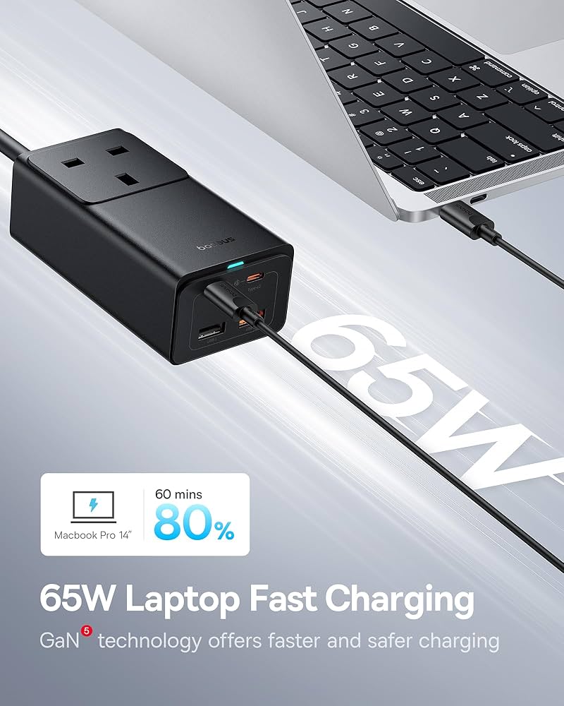 • ⚡ 65W Fast Charging: Supports advanced GaN5 technology to provide ultra-fast charging for devices like laptops, MacBooks, and smartphones.