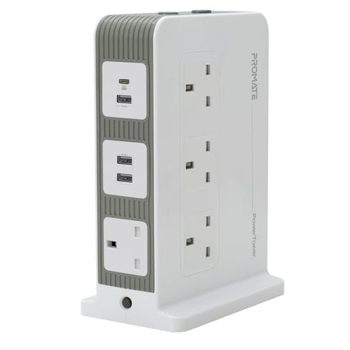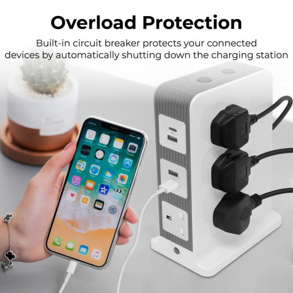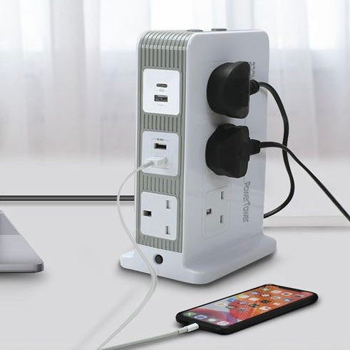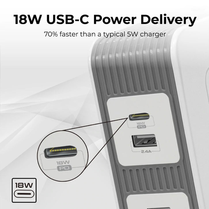 Charge multiple power hungry devices quickly and simultaneously with PowerTower. The PowerTower delivers a whopping 3250W AC output that lets you use power hungry devices like hairdryers, curlers, shavers, etc. In addition PowerTower features 4 USB charging ports and an 18W USB-C charging port leaving the AC connections free. Powerful charging simplified with PowerTower.