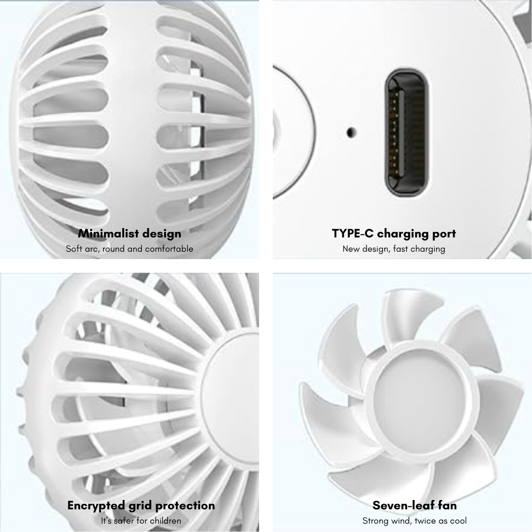 [Rechargeable Battery] This handheld fan has a 1200mAh capacity battery, which provides 2.5-8 hours playtime (depending on different speeds) after fully charged. Comes with a charging cable, you can charge it from a regular outlet, computer or any other device via USB port.