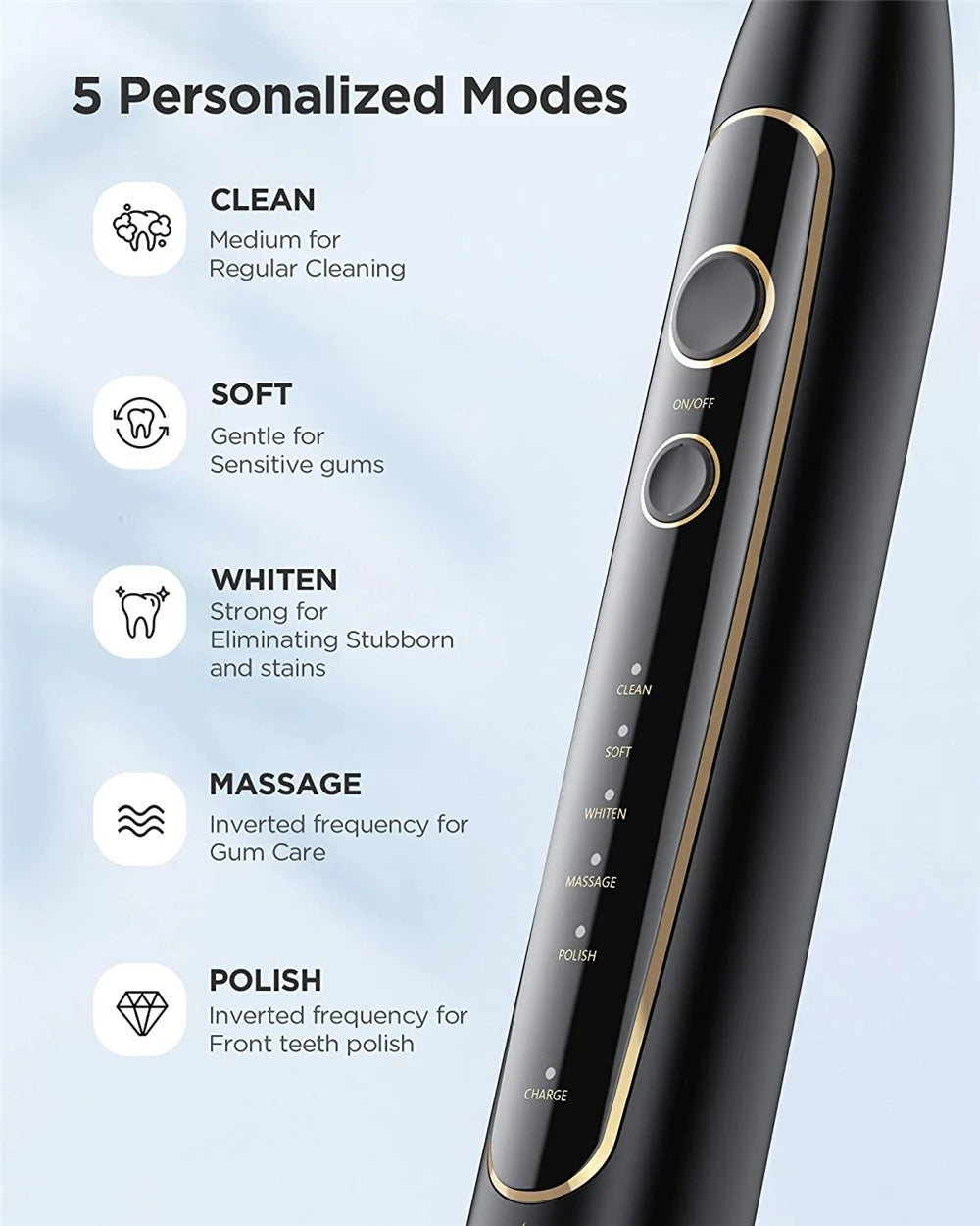 Description: The Fairywill FW-2056 Sonic Electric Toothbrush features high-end ultrasonic technology that delivers a deep and thorough cleaning of teeth and gums. With 8 replacement brush heads, you can easily replace your brush when needed to ensure the ultimate in hygiene and hygiene. In addition, the brush comes with a handy travel case that keeps the toothbrush safe and clean while traveling. Enjoy a professional dental cleaning experience at home or on the go with the Fairywill FW-2056.