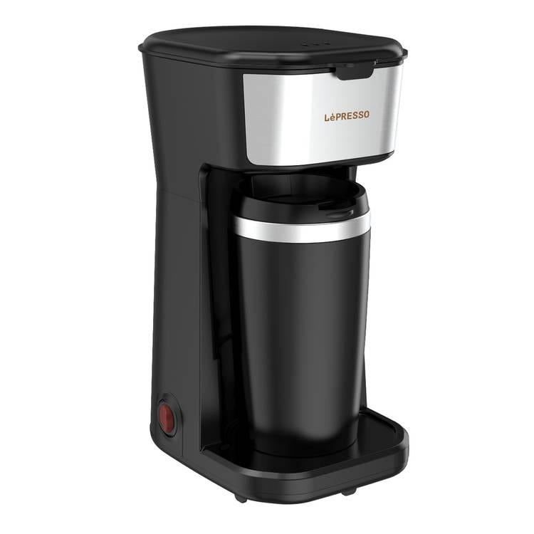 The LePresso Instant Coffee Maker is a lightweight home appliance with a 400ml insulated travel mug, which brews your daily coffee directly into a portable mug with one click. You start the process by filling the water reservoir and coffee container, then with just one push of a button you'll have 400ml of freshly drip coffee in no time. Remember, there is no need to change the coffee filter every time, as this device uses reusable nylon filters. This operation is safe thanks to overheat protection that automatically turns off your device in the event of any sudden electrical failure. Start your day with a cup of perfect hot coffee anytime, anywhere.