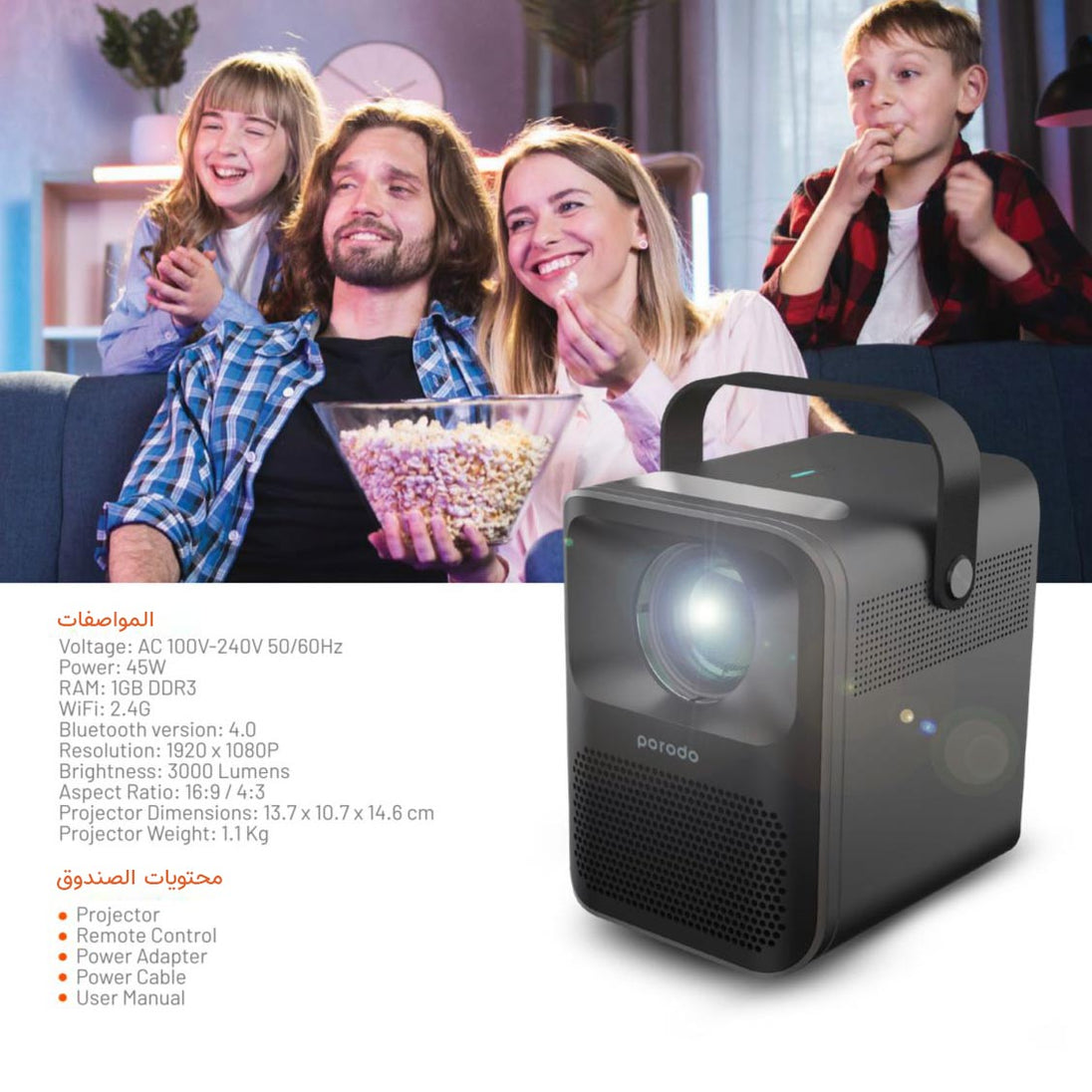 Portable battery projector from Porodo. It is characterized by high quality, light weight and ease of carrying. It gives you a clear display and vision with an image resolution of up to 1080 pixels HD. With its elegant and modern design, it will give you a wonderful cinematic experience at home and enable you to watch movies and enjoy parties.