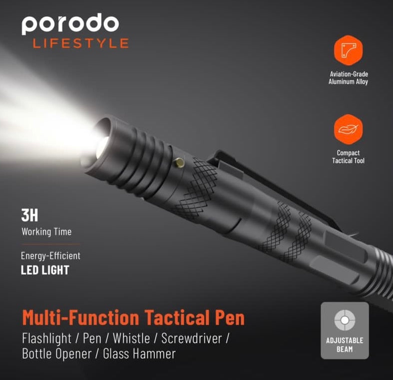 If you need a versatile tool for your daily needs and emergency preparedness, the Porodo Multi-Function Pen could be the ideal choice. It can be easily carried in a pocket or bag and used in many different situations.