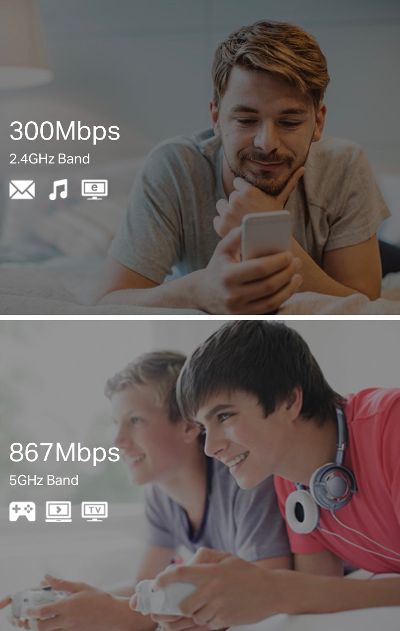 High-Speed Dual Band Wi-Fi for Better Connections The RE305 lets you keep more devices connected at the same time with its 2.4GHz 300Mbps and 5GHz 867Mbps dual bands. Use the 2.4GHz band to send email and browse the web, and the 5GHz band for gaming and HD streaming.