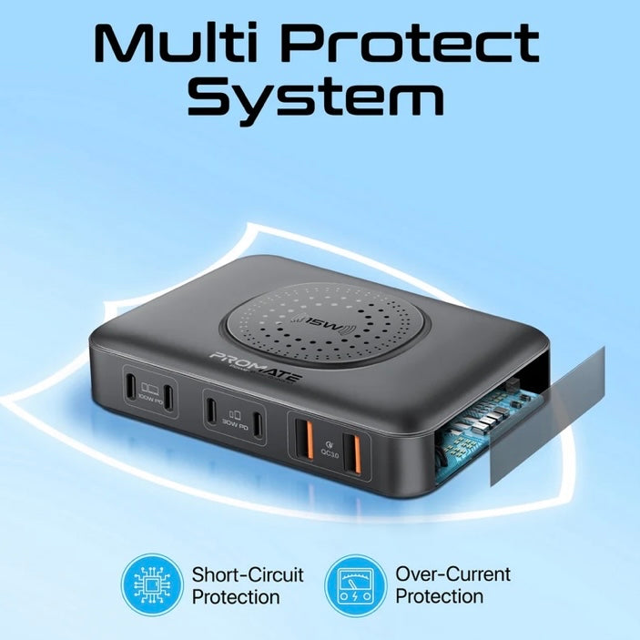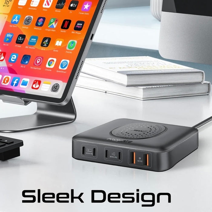 The Promate PowerBase-Gan100 GaNFast™ GaN Charging Station with 15W Wireless Charger delivers an efficient charging experience with the combination of compact size and less heat. With amazing features, this station can charge four power-hungry devices at high speed simultaneously with a power ranging between 30W and 100W. The PowerBase-GaN100 features a 15W wireless charging module that perfectly matches your compatible devices for super-fast charging. You can also fast charge 4 times via two Qualcomm Quick Charge 3.0 ports. Charge in a jiffy with this unique station to charge all your devices at high speed.