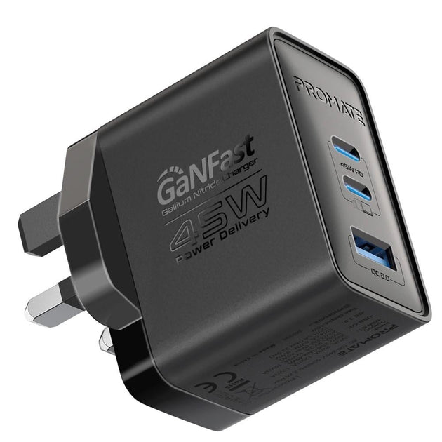 Promate 45W 3-Port Wall Charger with GaNFast™ Technology – Multi-Plug Support (EU/UK)