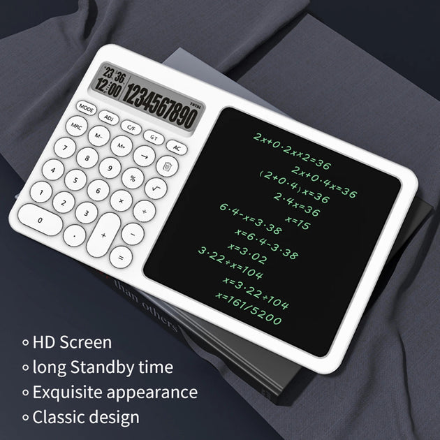A calculator that combines traditional functions with the ability to write and erase notes with an LSD screen