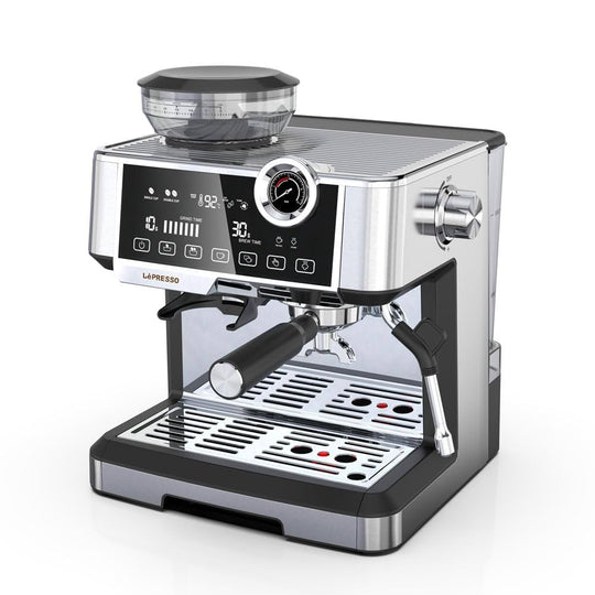 Coffee Maker with Coffee Grinder, Adjustable Grind Settings, 19 Bar Power, 2.5L Capacity, Cup Warmer, and Interactive Display by Lepresso