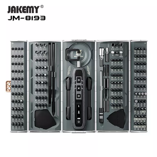 JAKEMY JM-8193 180 in 1 Smart Rectangular Electric Screwdriver Set features a small electric case with smart LED feature, with three torque speeds. **Features:** - **Patent No.:** CN308004050S | CN307938370S | ZL202320164283.8 Completely prevents counterfeiting. -...Sale price AED 165.00Regular price AED 190.00 -