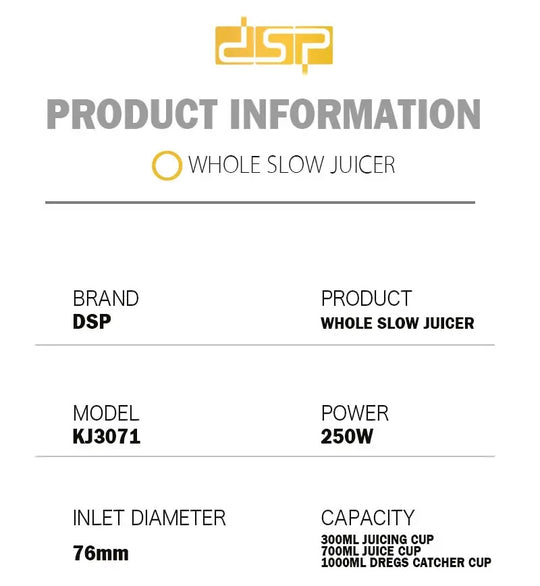 DSP OEM fully stainless steel fruit and vegetable juicer machine a description: DSP 250W Whole Slow Juicer KJ3071 Specifications: Model: KJ3071 Power: 250 watts Voltage: 220-240V ~ 50/60Hz Juice tank: 1 litre Residue tank: 0.7 litres...Regular price AED 275.00 -
