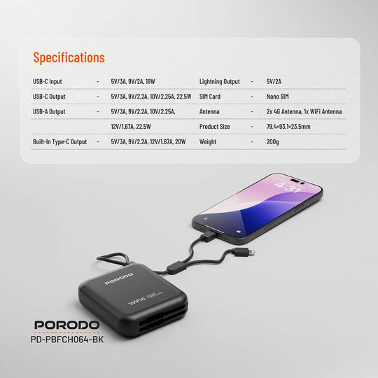 No reviewsPorodo 10000mAh Power Bank and LTE Pocket Modem – Pocket Router 📶💼 Fast connection and charging in one device! The Porodo Pocket Router combines the power of a 10,000mAh power bank with an LTE-enabled pocket modem,...Sale price AED 225.00Regular price AED 250.00 -
