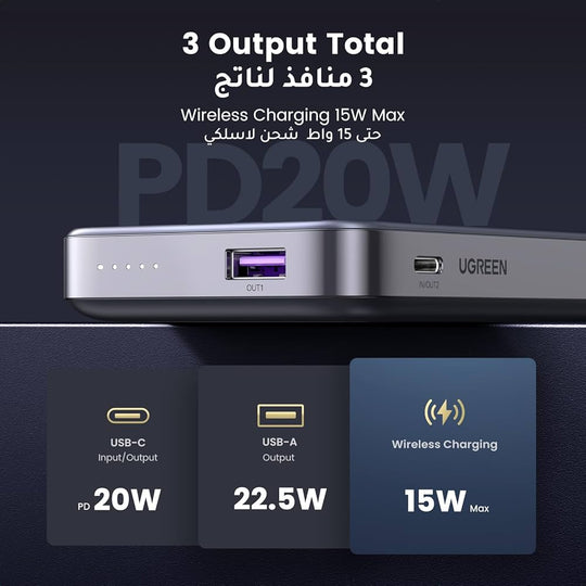 UGREEN 10000mAh Power Bank with Type-C Port and Wireless Charging