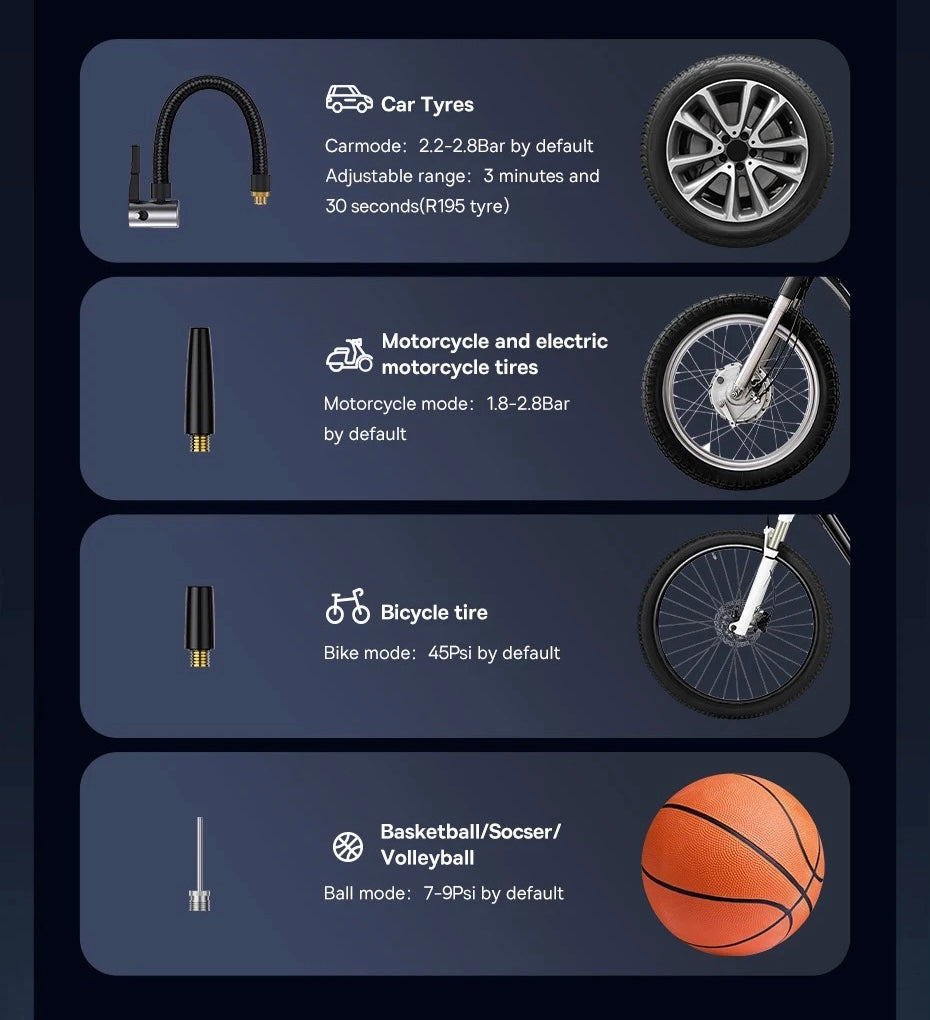 Thanks to its portable design, you can easily carry it in the trunk of your car or backpack, making it ideal for travel and emergency use. It comes with various attachments that include different sized nozzles to fit different types of tyres.