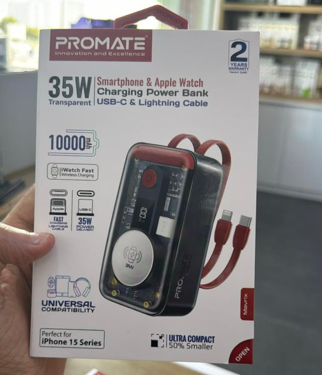 The Promate 35W power regulator is transparent, compatible with smart devices and Apple Watch, and comes with a USB-C Lightning cable and a 10,000mAh battery.