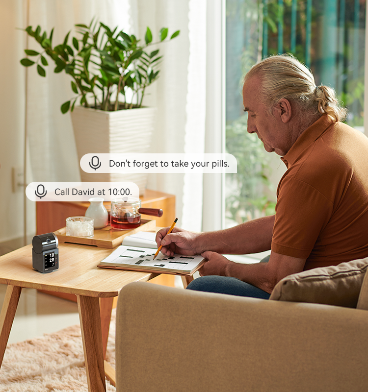 You can set up voice memos in the app to remind your loved ones at home of things they need to be aware of, and the Rex VT will play the pre-recorded audio as if you were there.