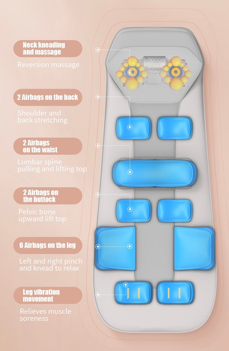 Airbag massage: There is a group of 12 airbags on the shoulder and upper neck. When the airbag is compressed, pressure is applied to the sides to relax the muscles of the neck, shoulder and waist.