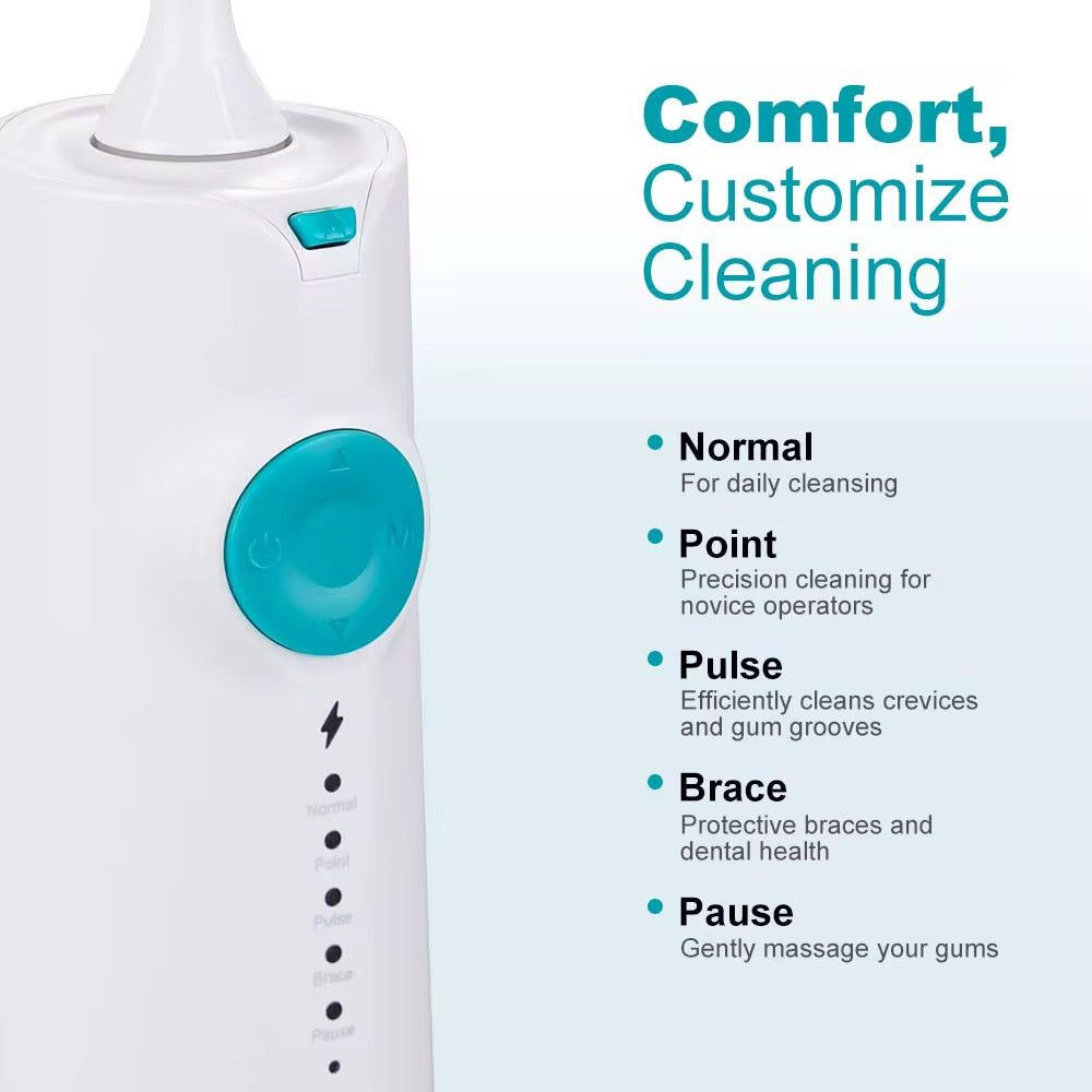 • High-pressure water jet to remove food debris and plaque from between teeth and under the gums