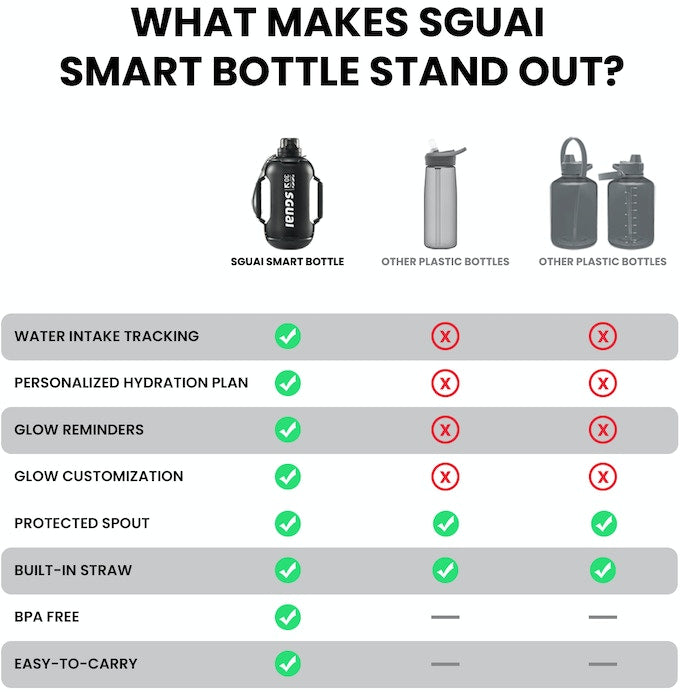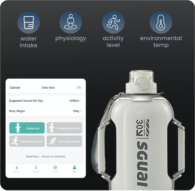 SGUAI Smart Bottle is a multi-functional smart water bottle. It features a feature that reminds the user to drink water regularly, and tracks and analyzes water consumption.