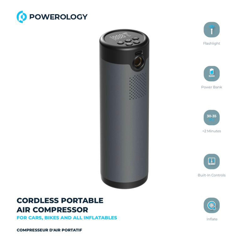 The Powerology Cordless Portable Air Pump is a versatile and convenient tool for inflating tires, bicycles, and a variety of inflatable items. This compact device offers the freedom of use without cables, making it ideal for on-the-go use. Here are some key features and benefits: