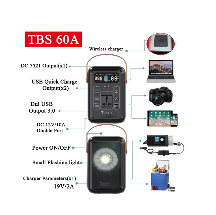 Enjoy a reliable, portable power source with the Toby's TBS 60A Power Station . Featuring a 300V power adapter and a multi-functional design, it's ideal for travel, camping, and emergency situations.