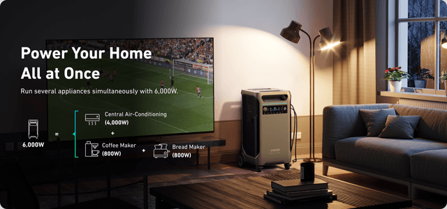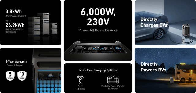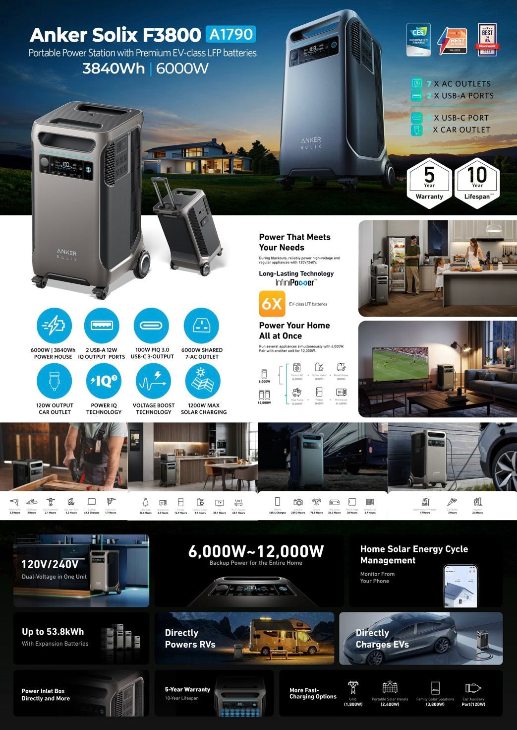 The Anker Solix F3800 portable power station comes with a capacity of 3840Wh and a power of 6000W. Designed for easy-to-use home backup (accessories sold separately). It provides 6000W power with a 120V/240V split phase distribution in one unit for devices that need a lot of power. It has an expandable capacity of 3.84kWh to 26.9kWh with the ability to connect up to 6 expansion batteries (Anker SOLIX BP3800) for extended capacity of up to 12kW (53.8kWh) for extended periods of power outage. It supports 2400W solar input, allowing the battery to be charged from 0 to 80% in as little as 1.5 hours using sunlight. Equipped with NEMA 14-50 and L14-30 outlets to charge your electric cars and recreational vehicles. You can intelligently monitor the power via APP and connect via Bluetooth and WiFi.