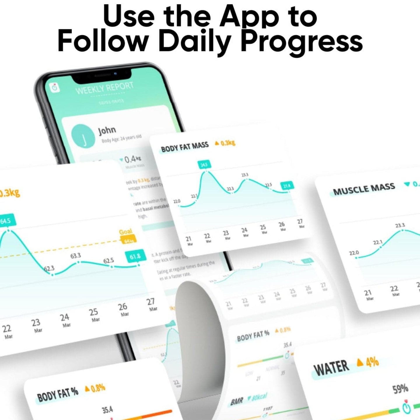 - 12 Body Measurements: Understand how your body changes throughout your fitness journey with 12 key insights, including weight, body fat percentage, bone and muscle mass, and more.