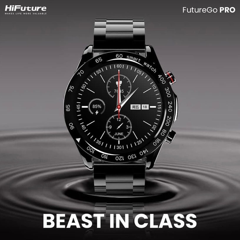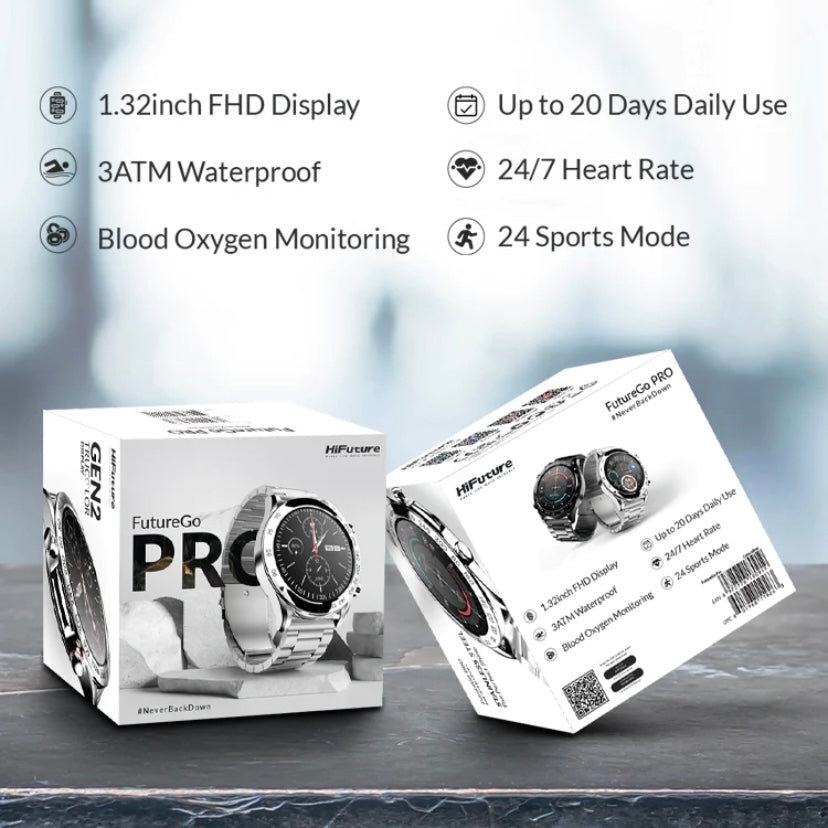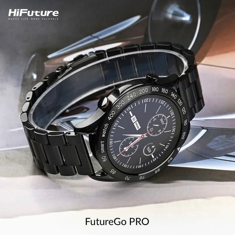 The HiFuture FutureGo Pro smart watch with stainless steel band comes with a large 1.32-inch screen and FHD display quality with a resolution of 360x360 pixels, providing clear and beautiful images. It works with Bluetooth 5.0 technology and is water resistant up to 3 meters, allowing you to use it while swimming and in outdoor activities.