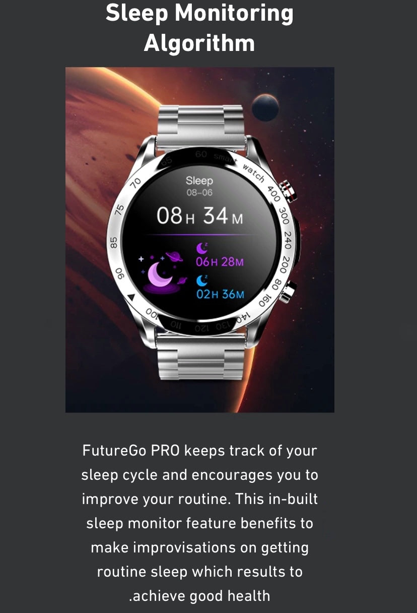 The HiFuture FutureGo Pro also lets you customize its interface and offers a personalized and versatile look. With the information sync feature, you will receive timely app updates and never miss important calls. The sleep monitoring feature analyzes your sleep cycle and provides tips to improve your sleep habits. It is a smart watch that contributes to improving your health and overall well-being.