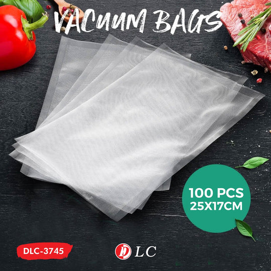 These are DLC vacuum bags with certain specifications: 1. **Quantity and Size:** - **Quantity:** The set contains 100 bags. - **Size:** Dimensions are 25x17 cm. 2. **Quality and durability:** - **High Durability:** Made of high quality...Regular price AED 20.00 -
