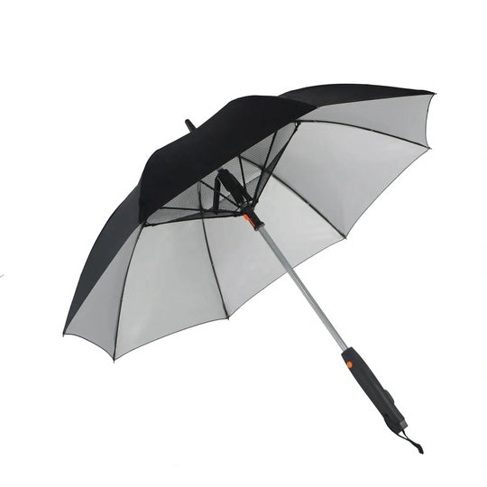 A distinctive summer umbrella with a fan and water spray