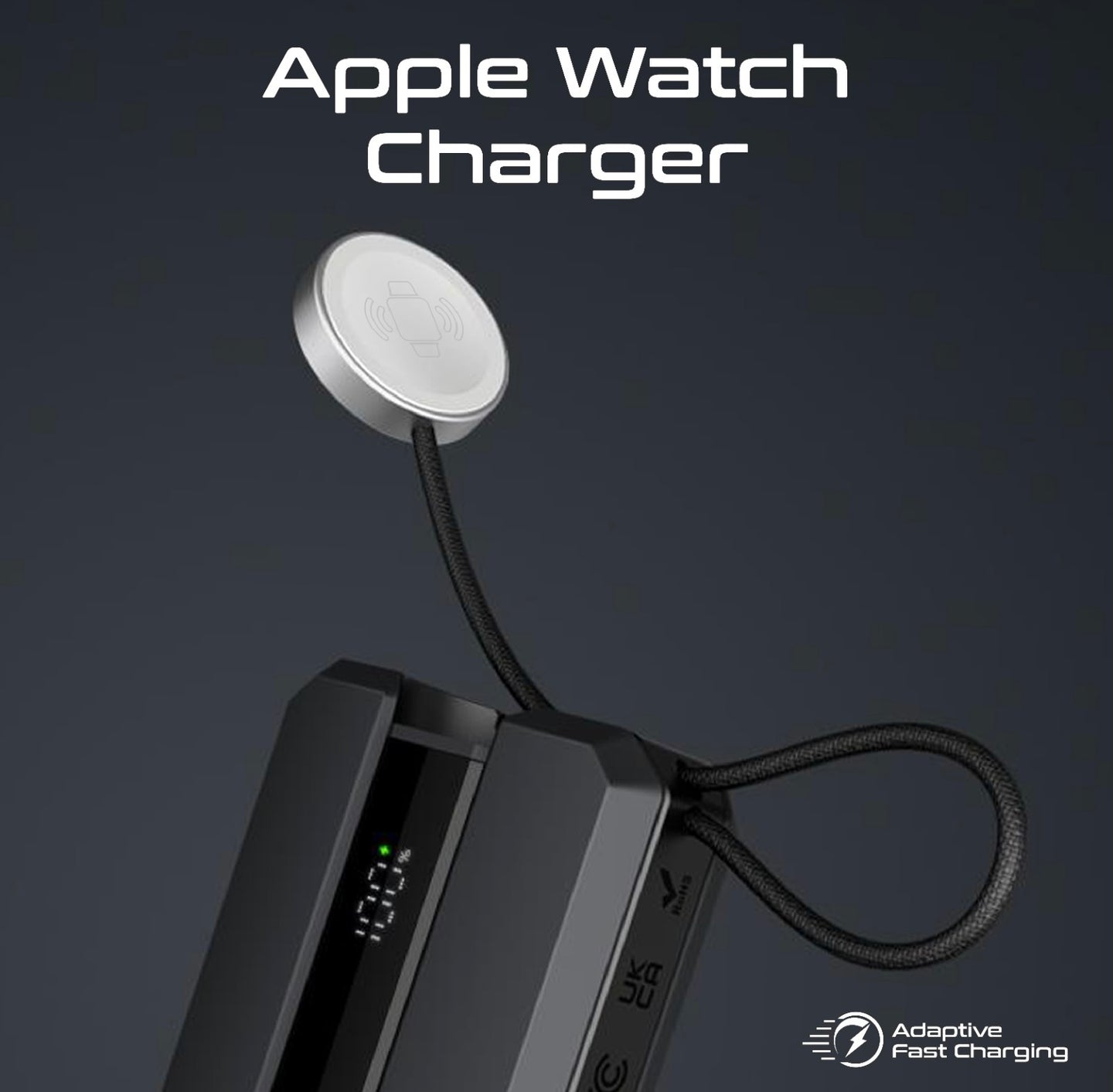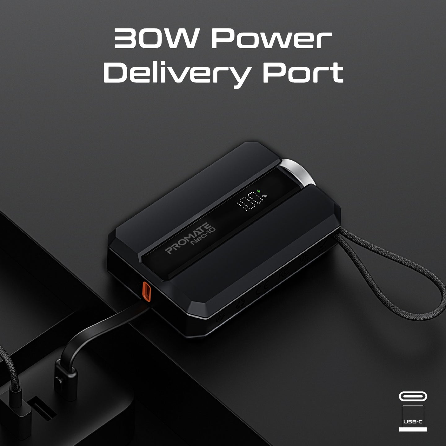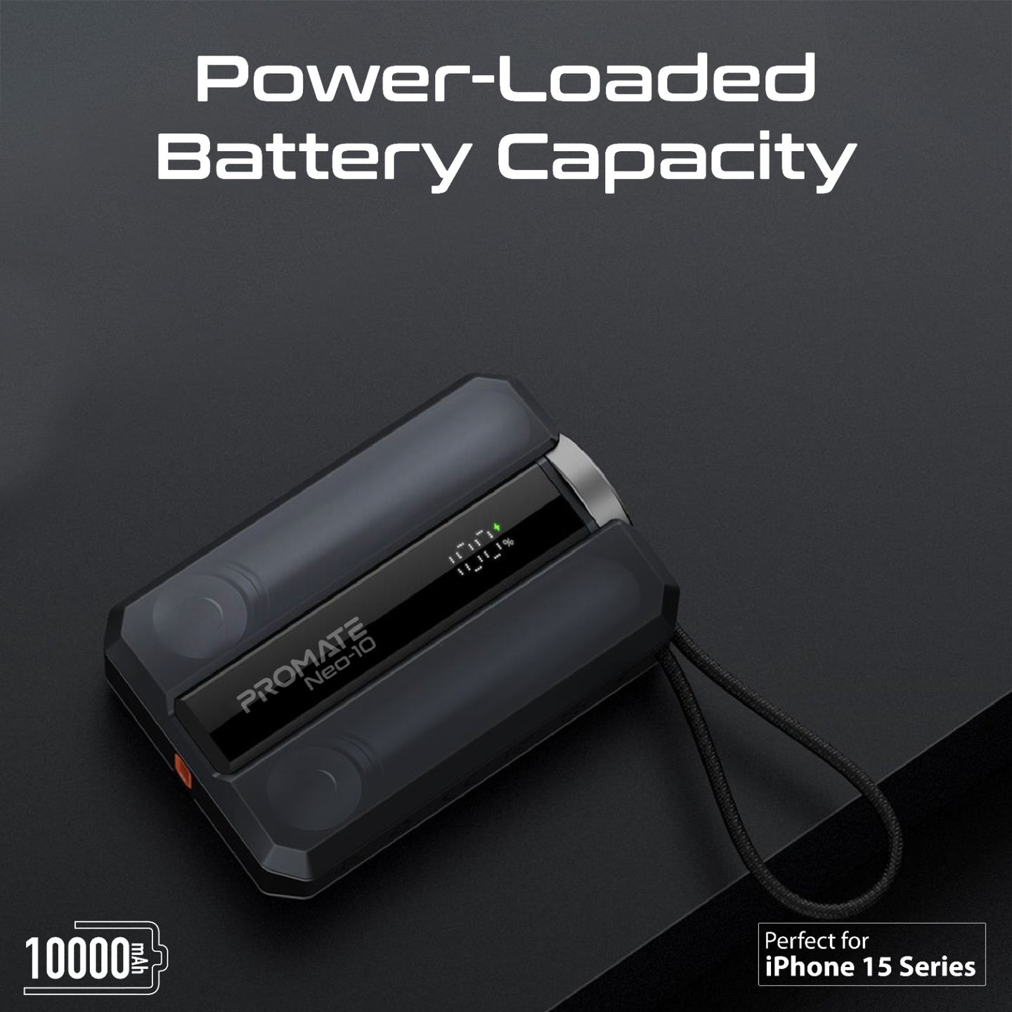 Promate 10,000 mAh 30W portable charger with Type-C cable, specially designed to charge iPhone and Apple Watch efficiently and quickly while on the go.