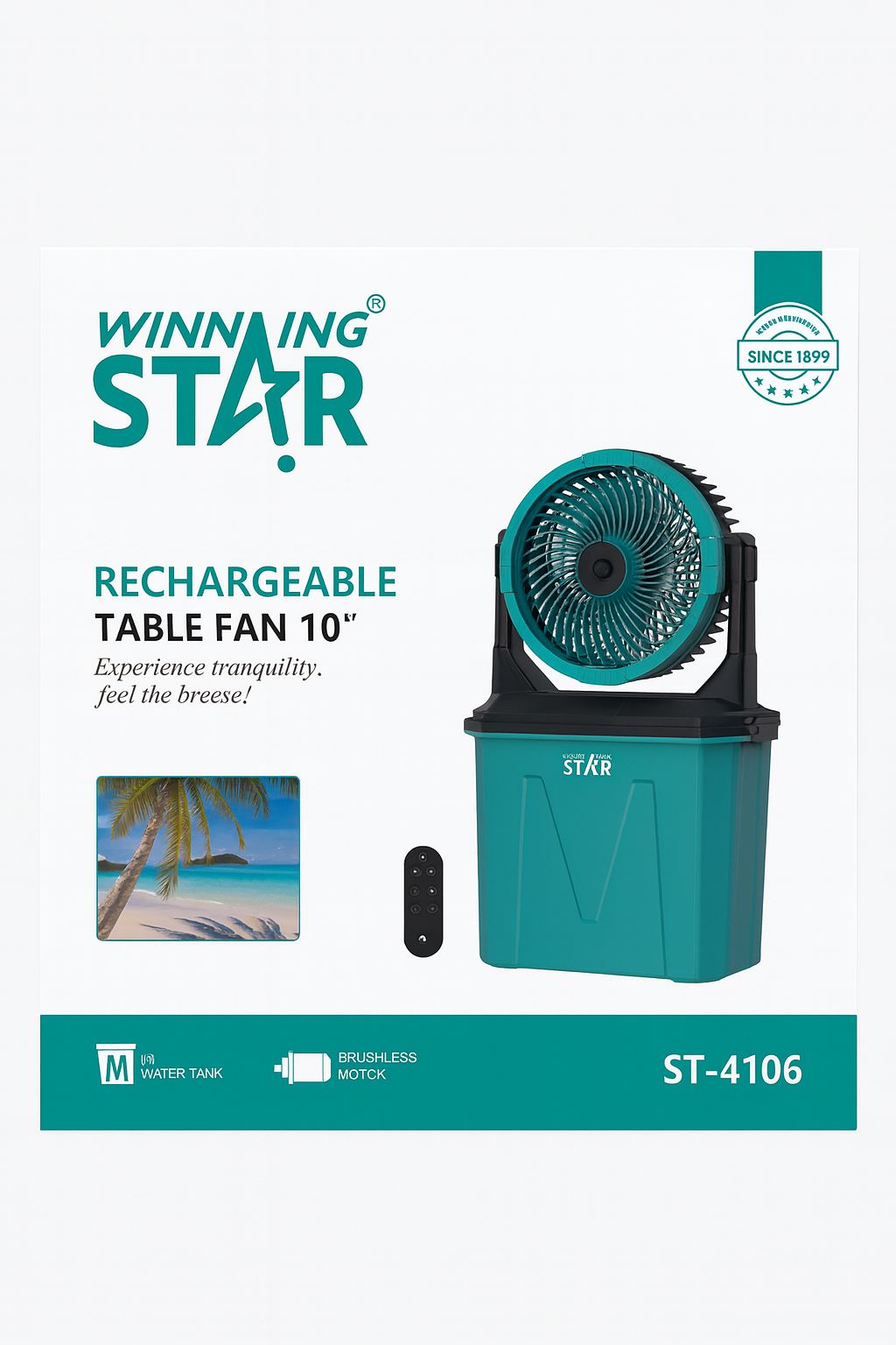 استمتع بالهواء المنعش في أي مكان مع مروحة الطاولة القابلة للشحن من Winning Star بحجم 10 إنش، المصممة لتمنحك الهدوء وانتعاش الهواء في المنزل أو المكتب أو أثناء التنقل. تأتي المروحة مزودة بمحرك بدون فرش (Brushless Motor) لضمان أداء قوي وهادئ مع عمر أطول. كما تتميز بوجود خزان ماء يمكن استخدامه لتعزيز الترطيب أو التبريد في الأجواء الحارة.