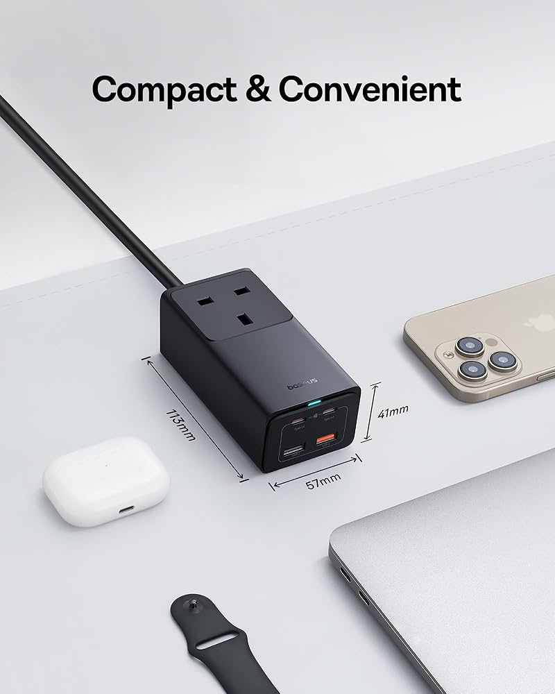 The Baseus 65W Power Strip is the all-in-one solution for all your charging needs—power, safety, and style in one design. Perfect for travel, work, or home.