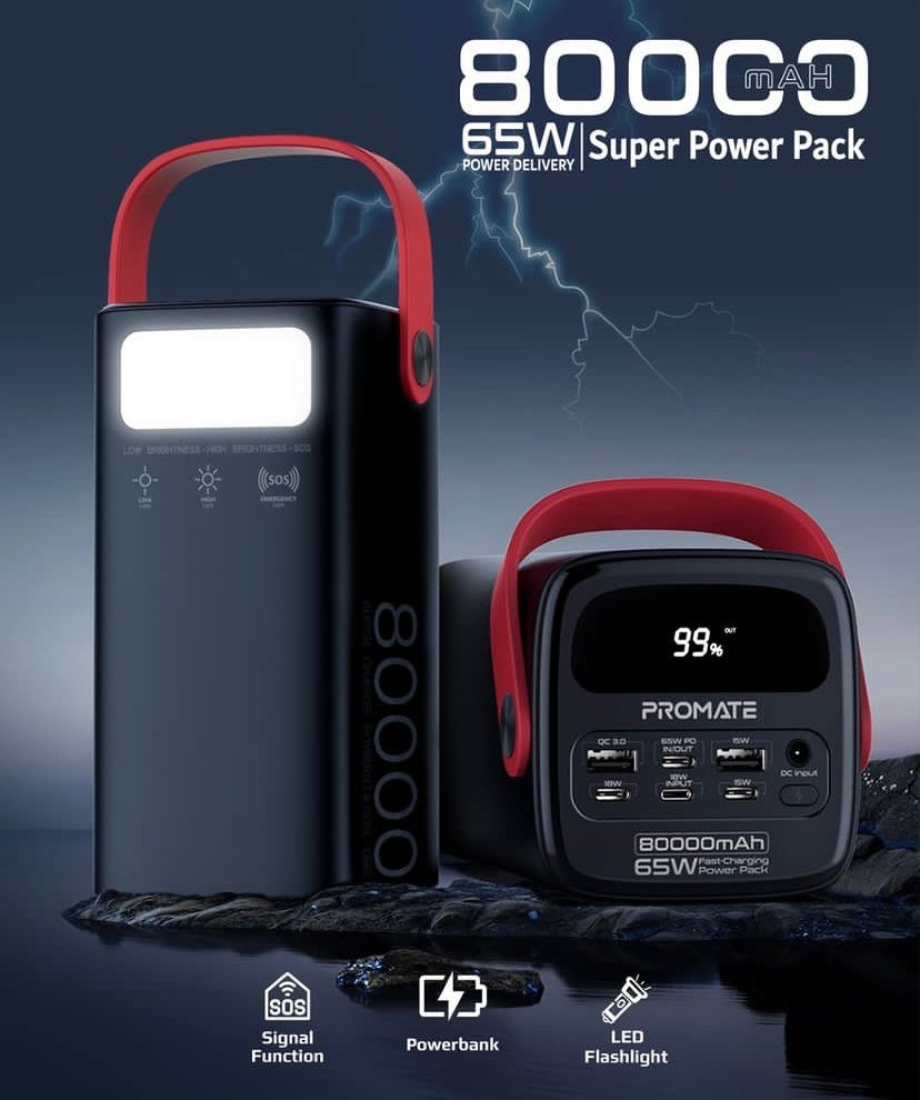 The Promate 80,000mAh 65W Power Pack Super Power Delivery is a powerful and versatile product that provides a centralized solution to your power needs. This pack has a huge capacity of 80,000 mAh, which makes it able to supply electronic devices with power for a long time.