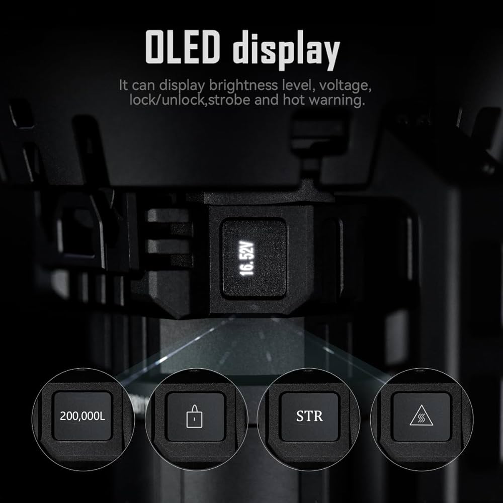 يأتي الكشاف مزودًا بـ شاشة OLED ذكية تعرض معلومات مهمة مثل مستوى البطارية، شدة الإضاءة، ووضع التشغيل، لتمنحك تحكمًا دقيقًا وتجربة استخدام احترافية.