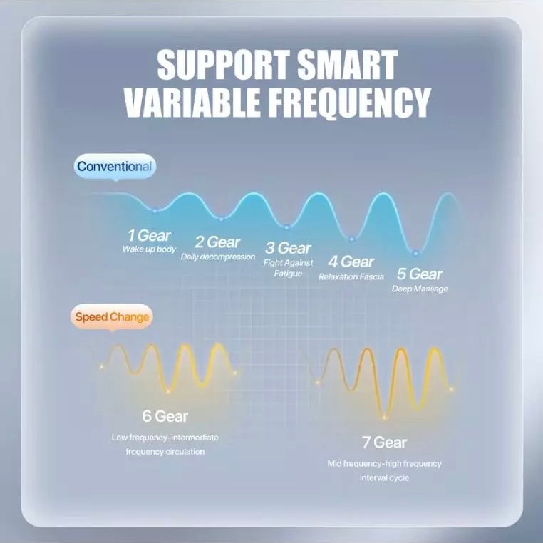4. There are 2 conventional modes + frequency conversion and 7 levels of beating frequency adjustment, suitable for before and after exercise, to meet different massage needs.