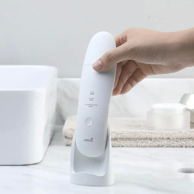 WellSkins WX-CJ101 Ultrasonic Skin Cleanser, designed to cleanse the skin, improve its appearance, remove blackheads, and deliver a deep cleansing action at a rate of 25 kHz, Color: White.