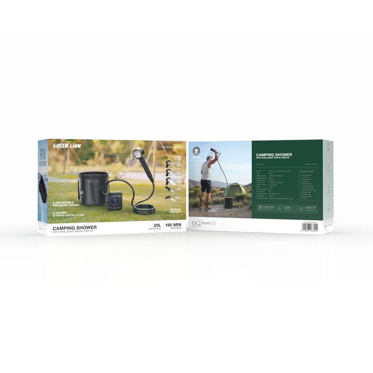 دش تخييم محمول من Green Lion بشاشة رقمية – قدرة تدفق 5–10 لتر/دقيقة، بطارية 8000mAh، حقيبة ماء 20 لتر، و4 أوضاع للاستحمام