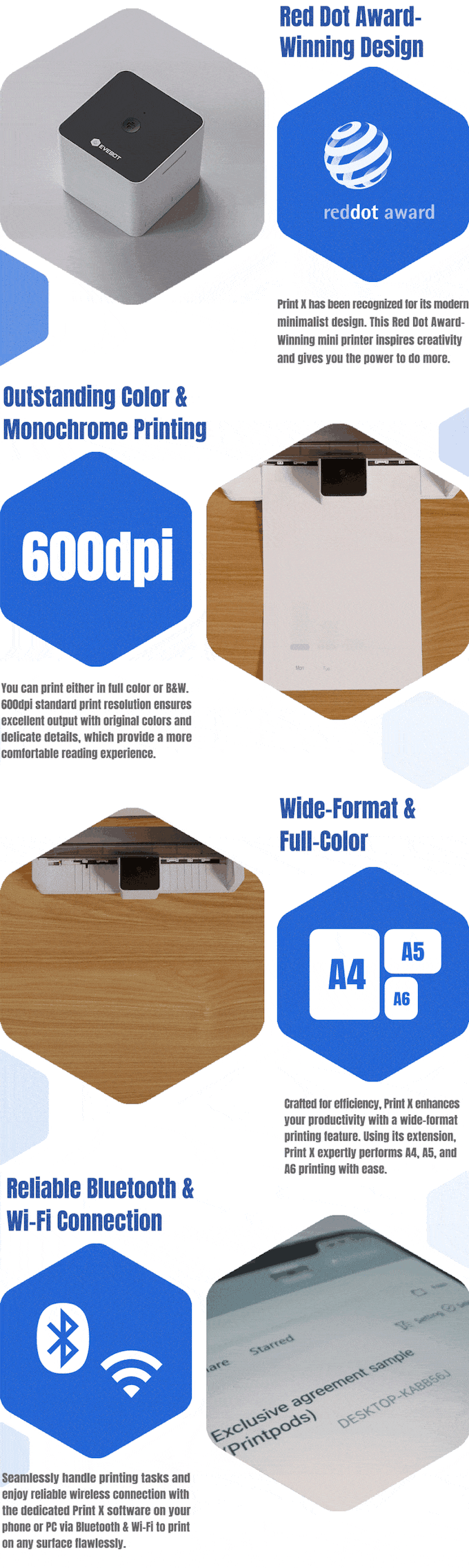 Print X هي الطابعة المحمولة المثالية التي تدمج إمكانية الأداة واللعب (T&T). استخدم Print X كطابعة محمولة على أي جسم للحصول على التنوع النهائي أو ضعها على التمديد المرفق، قم بتحميل المواد التي تحتاج إلى طباعتها داخل التطبيق عبر البلوتوث وراقبها وهي تنزلق على ورق A4 حيث يتم طباعة الكلمات والرسوم التوضيحية بسلاسة على السطح. ستكون مندهشًا من ما يمكن أن تقوم به هذه الطابعة بحجم الراحة في راحة يدك. تدعم Print X طباعة A4 بتنسيق واسع، والطباعة المحمولة بالألوان، وتتجاوز الحدود لتمنحك حرية تحويل إبداعك إلى واقع من خلال مجموعة تطوير البرمجيات (SDK). لقد اختبرنا وتحققنا من فكرة طباعة العلامات كواحدة من التوسعات المستقبلية المبهرة لـ Print X مع SDK القوي. ترقبوا! لا يمكننا الانتظار لاستكشاف الإمكانيات اللانهائية لـ Print X معكم. بغض النظر عن مهمة الطباعة، توفر Print X طباعة ملونة بجودة عالية، بشكل بسيط وفعال وبحجم مدمج، في أي وقت وفي أي مكان!