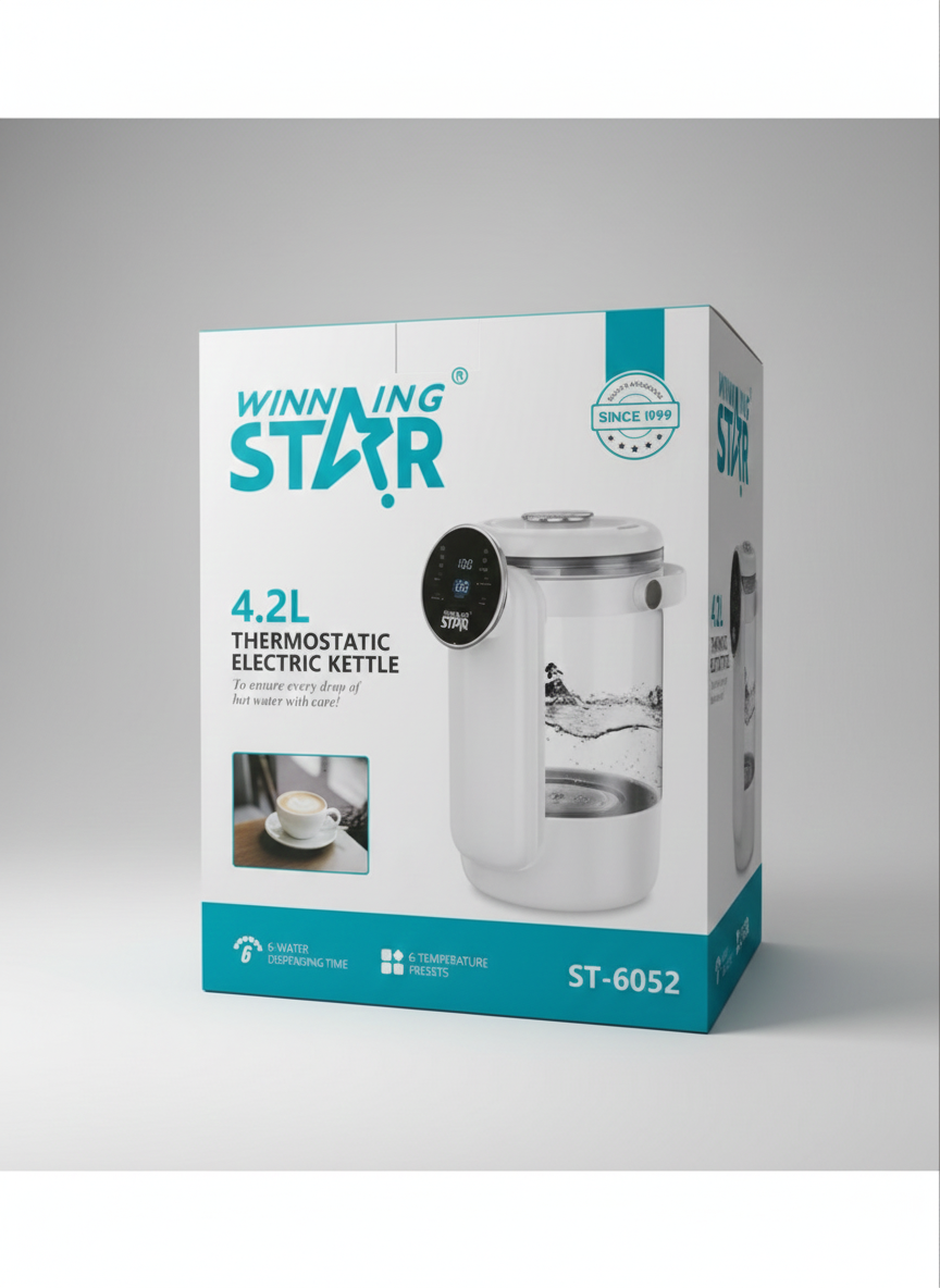 الحاجة إلى إعادة غليان الماء مراراً وتكراراً مع الغلاية الكهربائية الحرارية WINNING STAR ST-6052. تم تصميم هذه الغلاية لـ "ضمان كل قطرة ماء ساخن بعناية!" (To ensure every drop of hot water with care!) عبر توفير تسخين سريع وتحكم دقيق في درجة الحرارة. إنها مثالية لجميع احتياجات المشروبات الساخنة في المنزل أو المكتب.
