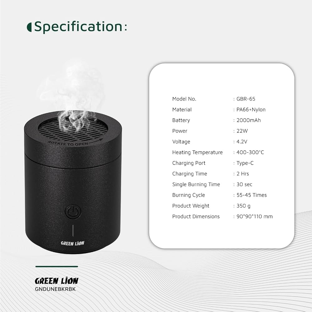 مبخرة Green Lion Dune هي الحل العصري والآمن للاستمتاع برائحة البخور والعود بقوة وفعالية داخل المنزل. تتميز بتصميم أنيق ولون أسود فاخر، مع أداء عالي بقدرة 22 واط يصل إلى درجة حرارة 400° مئوية لاستخراج أقوى وأغنى الروائح من البخور.