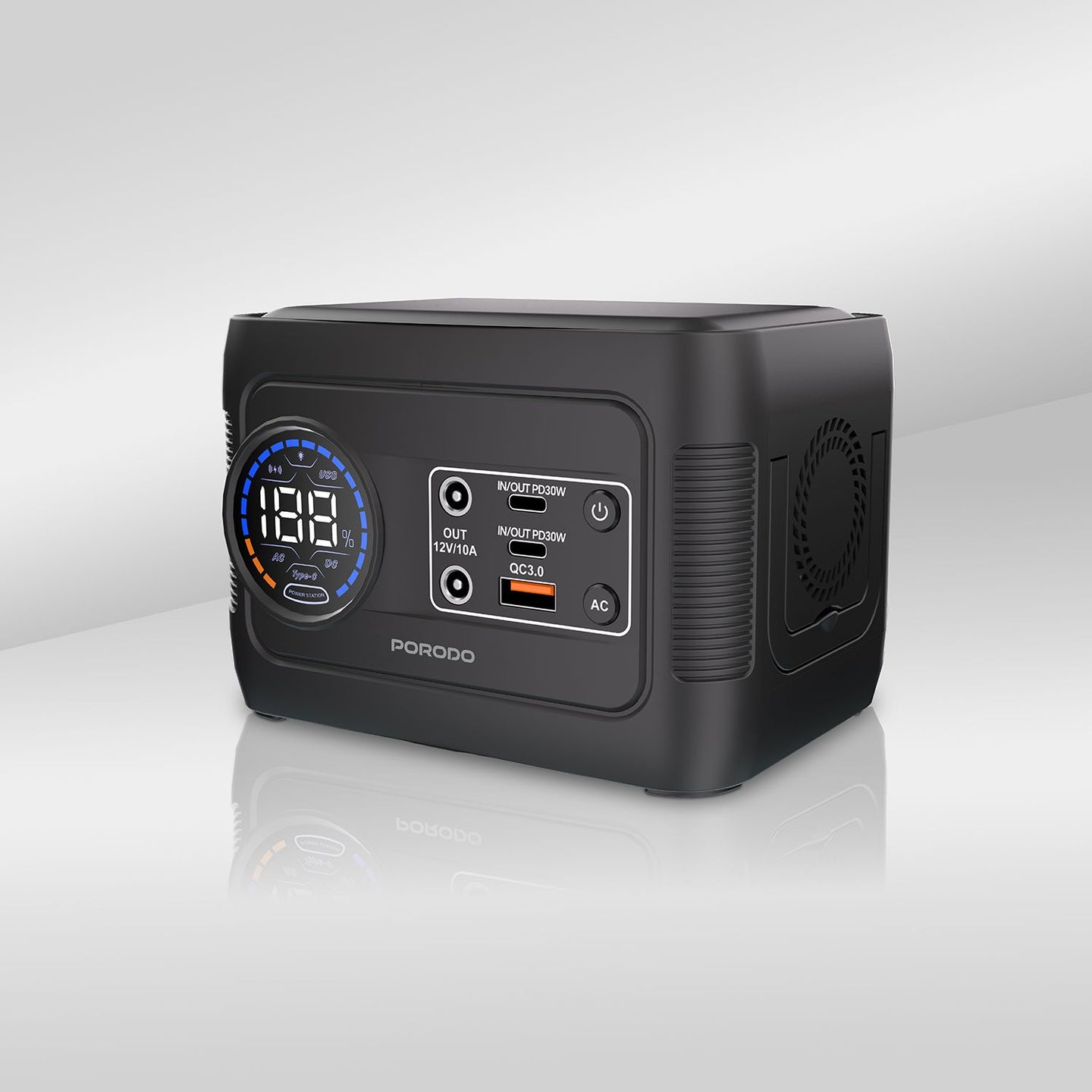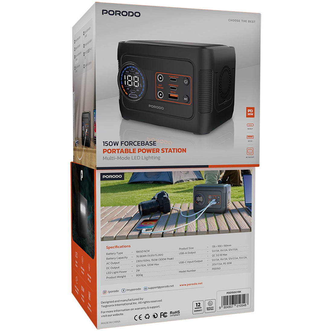 محطة الطاقة المحمولة 150W مع إضاءة LED متعددة الأوضاع وشاشة رقمية – قدرة 76.96Wh من Porodo