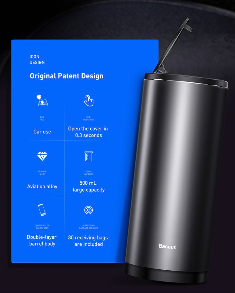 Baseus Car Trash Bin هي سلة قمامة سيارة تلقائية مصنوعة من سبائك الألومنيوم، تستخدم للتخلص من الأتربة والقمامة في السيارة. تعمل كحافظة للنفايات وصندوق تخزين منظم للأغراض الصغيرة داخل السيارة